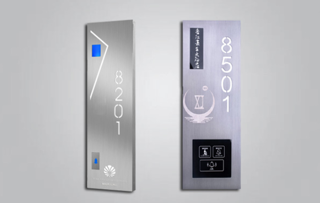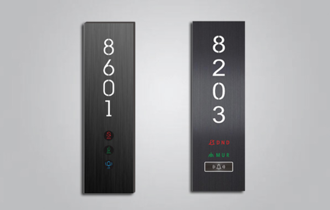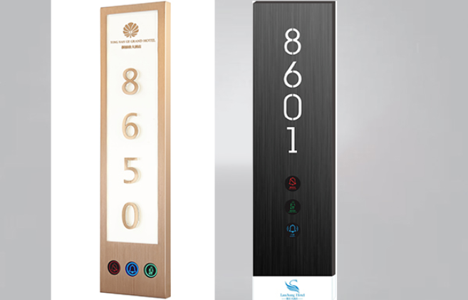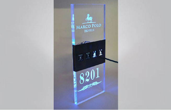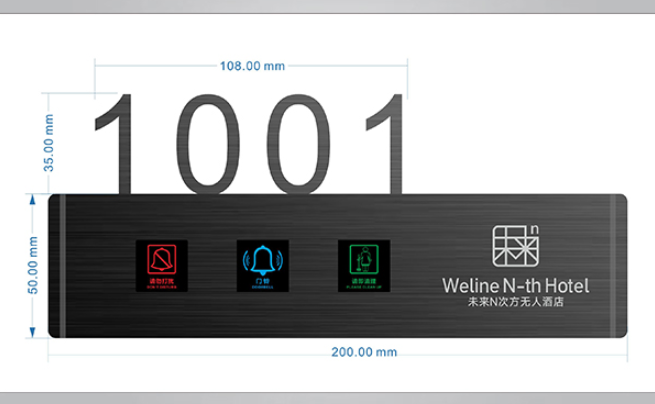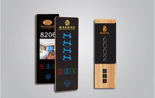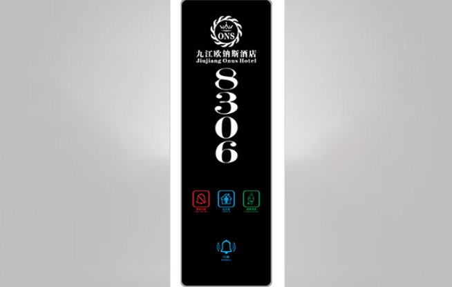 门口显示牌:专为酒店精心设计的“六合一”显示牌系统,让酒店服务人员及来访人员容易识别酒店房号和客房内外信息同步。集房间号码显示,LOGO显示,勿扰,清理,房态,门铃按键为一体的酒店客房智能门牌。